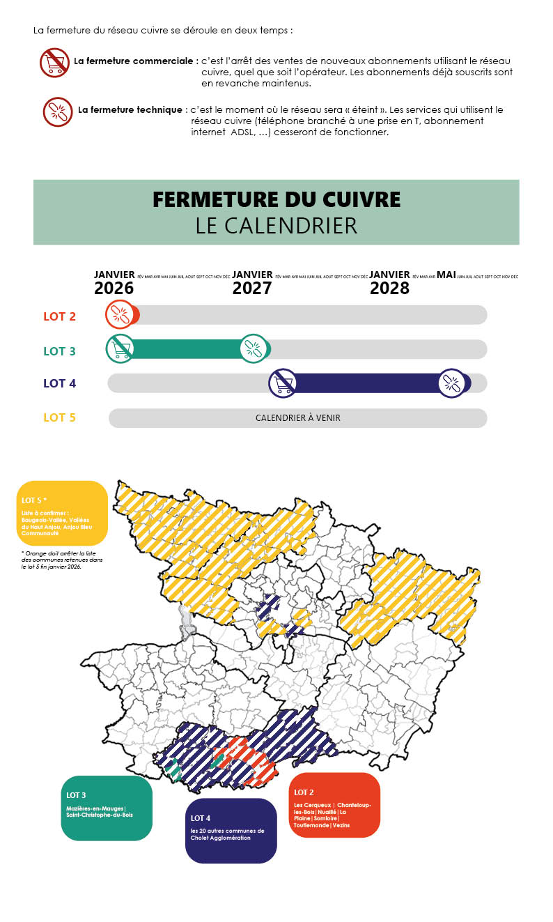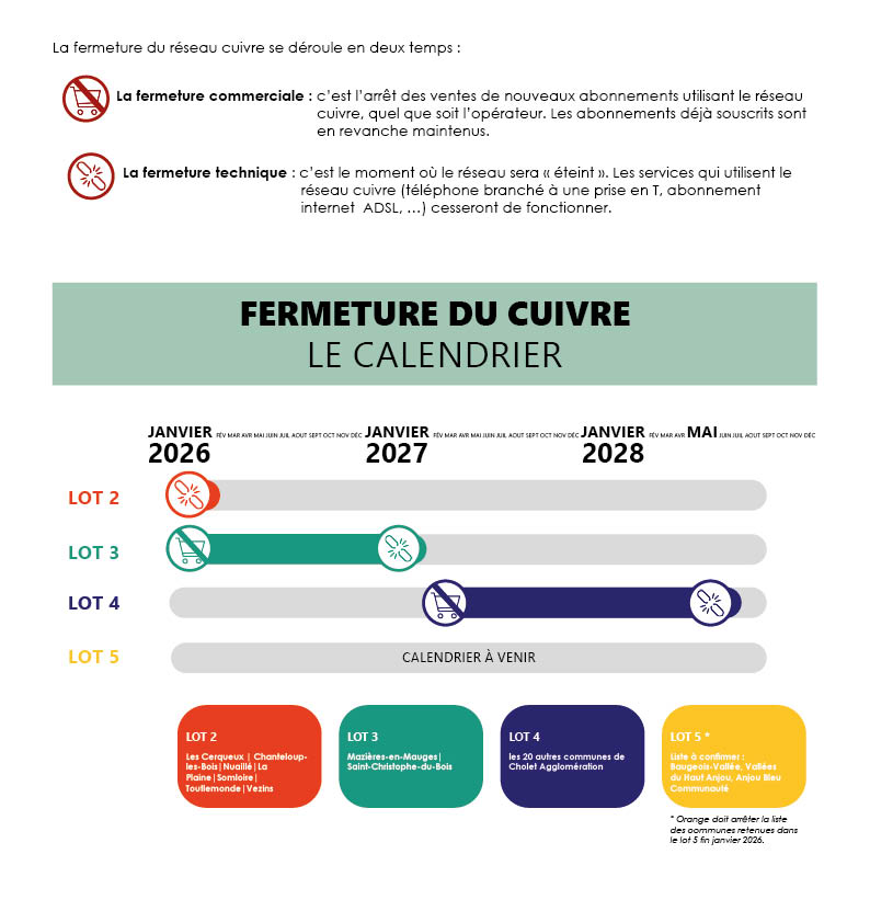 Pilotée par Orange, propriétaire historique, la fermeture du réseau cuivre s’effectuera progressivement, par lots de sept groupes de communes, déterminés en concertation avec les autres opérateurs et les maires concernés.