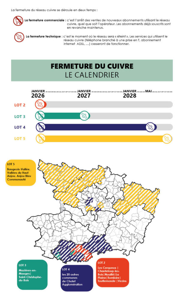 Pilotée par Orange, propriétaire historique, la fermeture du réseau cuivre s’effectuera progressivement, par sept lots de communes, déterminés en concertation avec les autres opérateurs et les maires concernés.